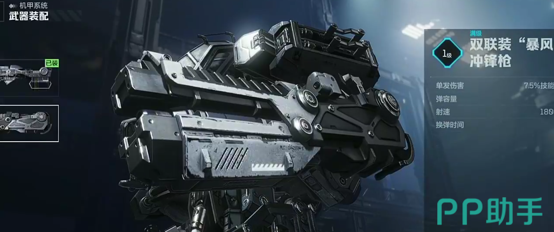 暴风的核心优势在于出色的机动性能与持续火力输出能力。该机甲共支持三类配件装配:主武器及两个挂件槽位。其中主武器可从三管转轮机枪和暴风雪冲锋枪之间进行选择,二者战术定位截然不同。暴风雪冲锋枪强调快速装填与短时间爆发击杀能力。