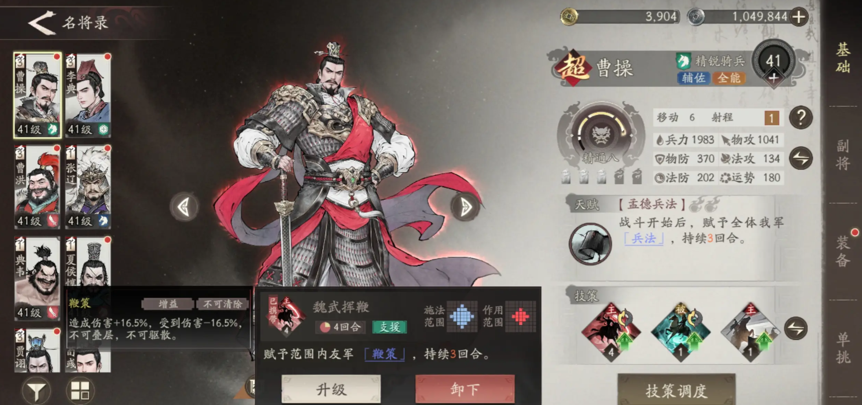 在组队策略上,曹操应作为主力辅助担当,副将则侧重于属性强化与战意恢复。卞氏是优选搭档之一,可为全体队友提供22%攻击力加成,显著提升队伍爆发力;邹氏适合担任物理输出位,同时具备战意补充能力,加快技能释放节奏;邢道荣也可纳入阵容,具备战意回复机制,使操作更具灵活性,配合曹操形成高效联动。