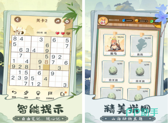 以经典数字逻辑为核心玩法,本作在传统数独规则基础上进行了创新升级。玩家需确保每一行、每一列以及每个小九宫格内都填入1至9不重复的数字。相比常规版本,这款游戏不仅拥有大量关卡设计,还提供了多种主题皮肤选择。通关后获得的奖励可用于解锁更多独特外观,例如来自山海经设定的小怪兽形象,增添了解谜过程中的趣味性。