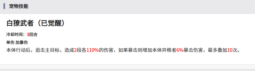 一层暴击类型的伤害,因为这里的暴击伤害提升的数值是不太一样的,所以每一层的提升带来的数值基本都是5%,或者是6%的数值,当然这个暴击伤害也是可以叠加的,最多的情况下是可以叠加到十层,所以此时基本能够达到50%或者是60%的整体暴击伤害,所以白獠武者它的整体强度也可以说是越打越强的,这类机制一般来说更适合参与一些场景的战斗,此时的优势会更高一些,给角色带来的提升也会更明显一些。