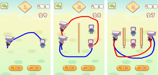 以寻找厕所为主要核心,覆盖丰富的关卡内容,其中有不同的人物角色,比如男性或女性等等,这些人物角色身体上的颜色完全不同,在特别混乱的场景中,需通过连线方式,寻找到对应颜色的卫生间。刚开始闯关时可能会觉得非常简单,无需动脑就可让其正常上厕所,但是随着关卡的难度升级之后,厕所和人物之间会存在很多的难题和障碍物,三个场景中包含4个不同难度的等级,快速操作让其第一时间上厕所。