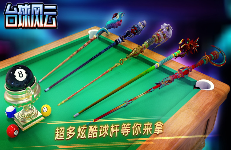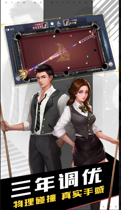 这款游戏模拟了台球锦标赛的规则,而且界面十分简洁,大家只需要精确的去击中球,然后把不同颜色的球打到袋子里就可以得分。两个人对战的时候,比较的是谁的击球技术更好,技术好的自然也会得分很高,游戏里还还原了现实打球的细节,完全比拟了现实中的体验感。并且游戏还准备了很多不同样式的球杆,大家完成任务就可以拿到奖励,用奖励去解锁新的球杆,换上新装备之后打球会变得更有劲儿。
