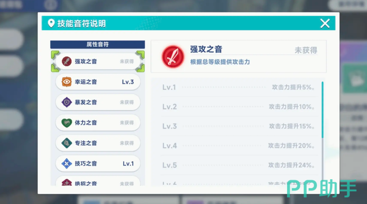 音符系统在游戏当中的基础作用,是强化玩家的基础属性值,隶属于不同属性的音符,能为玩家提供迥异的属性值加成,例如强攻音符可以增加玩家基础攻击倍率的5%,体力值音符可以增强玩家,基础生命数值20%到50%。