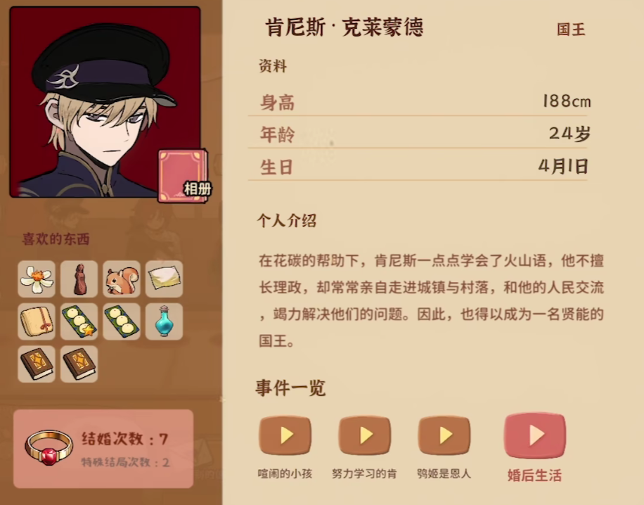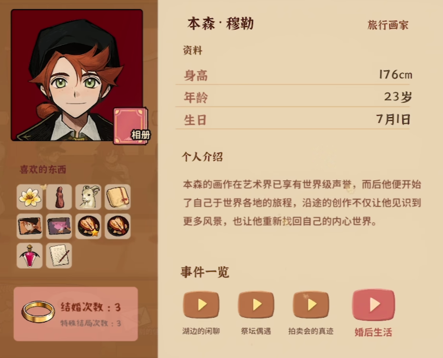 本森在游戏内的设定是画家,他最喜爱的礼物是金色兰花,以及火山女神木雕,同时,任意一样的画作,都可以提升他的好感度。