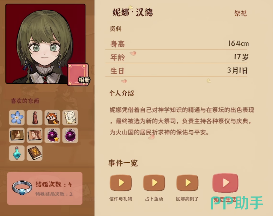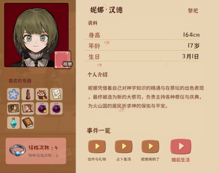 妮娜在游戏当中的设定是神官,固然她最喜爱的礼物是,勿忘我和睡火莲,勿忘我可以增加四点好感度,而睡火莲可以增加五点,同时,她还附带有一些特殊礼物,其中包含有火山女神的木雕、唱诗班乐谱集,这两件礼物需要通过其他NPC赠与才能取得。