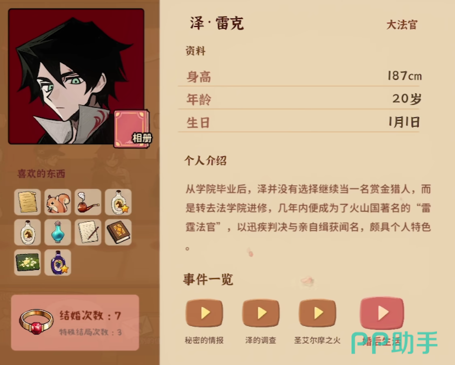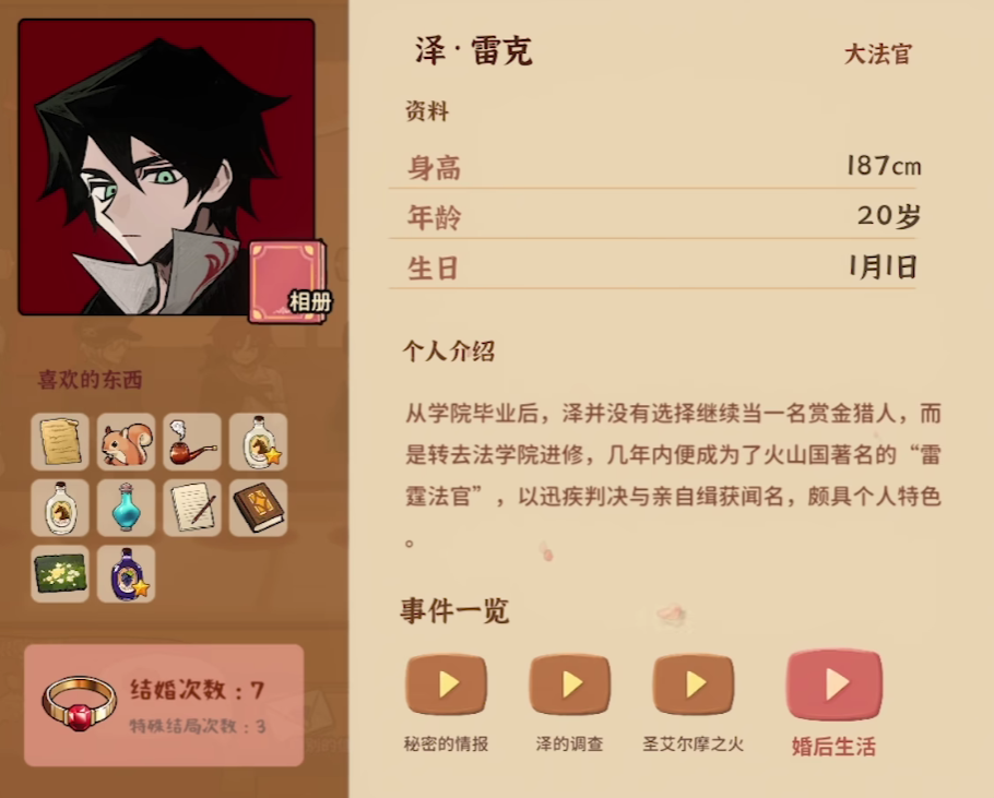 泽在游戏内的设定是大法官,最喜欢的礼物是金块和睡火莲,这两个物品都可以增加其好感度十点,玩家还可以赠送他魔物研究笔记,以及棕色烟斗,这两样物品需要玩家率先获取,朗和妮娜的好感度才能够取得。