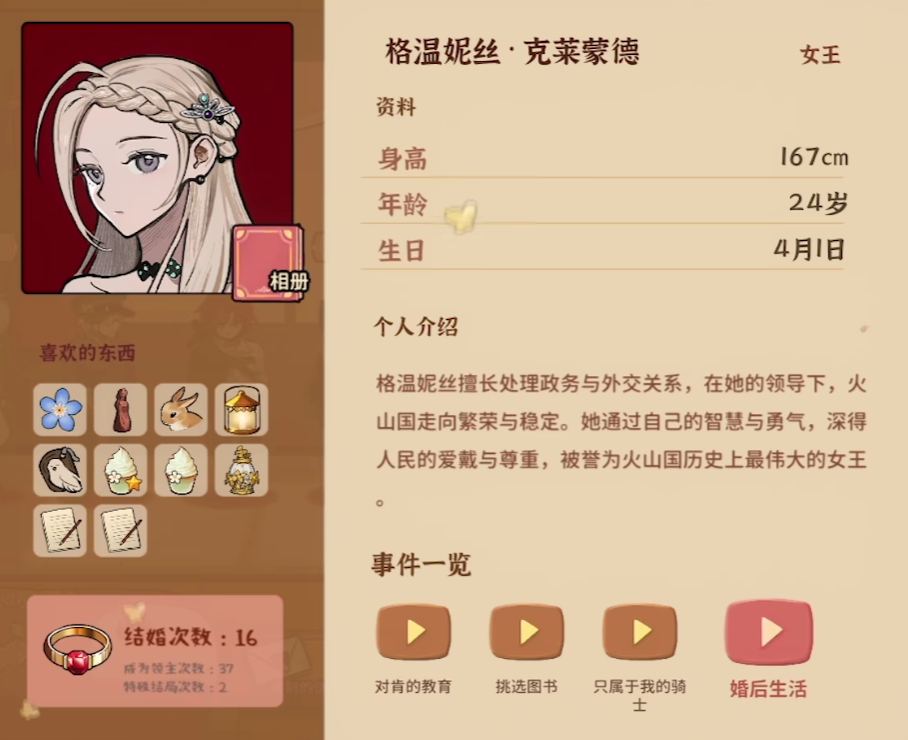 格温妮丝在游戏当中的设定是公主,她最喜爱的礼物是睡火莲,赠送之后,可以取得其好感度十点,次要选择是香醇野梅酒、红玫瑰,它们分别可以增加,公主好感度的五点和四点,睡火莲可以通过种植来取得,香醇野梅酒则需要玩家,先学习烹饪技能才能够取得。