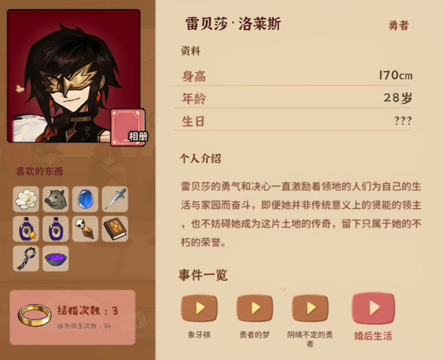 雷贝莎在游戏当中的设定是勇者,她最喜欢的礼物是茉莉花、银匕首、野猪,同时,她还附带有专属剧情,奴隶脚铐以及恶魔浓汤,玩家在持续推进主线后,就会被不断赠送物品,这些物品可以用于赠送给贝丽莎增加好感度。