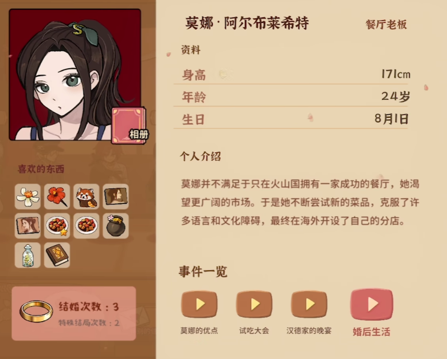 莫娜在游戏当中的设定是厨师,她最喜欢的礼物是睡火莲和勿忘我,睡火莲可以增加五点好感度,勿忘我可以增加两点好感度,其附带的特殊物品,包含有扶桑花发饰、催眠药水,扶桑花发饰是贝利卡在游戏当中赠送给玩家的,而催眠药水需要玩家,解锁魔药技能才能够制作。