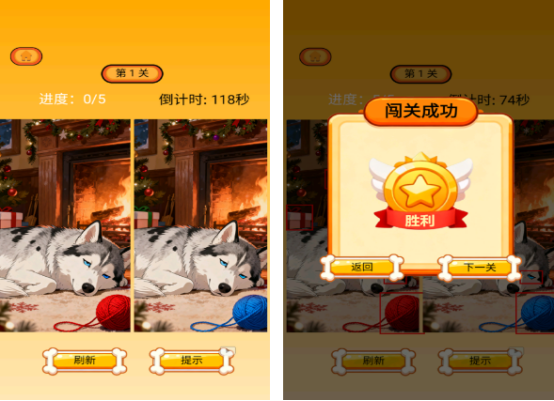 具备比较益智的这种特色,里面有可爱的小狗,需要及时的找到两张,看上去一样图片当中的不同之处,来完成任务。有丰富的关卡,也会有规定时间限制,所以必须要在玩的过程当中,仔细的对图片进行观察,只有在倒计时结束之前完成任务的情况下,才能过关,使里面的小狗被顺利的解救,让玩家也能有很好的成就感。