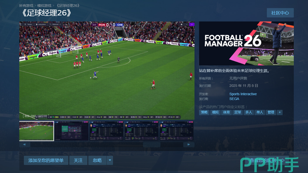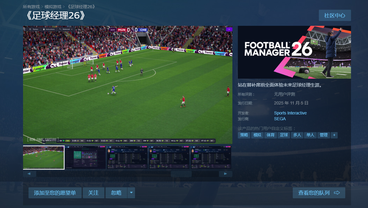 目前该作已开启预购,并正式登陆Steam平台。从商品页面可见,当前正处于首发折扣阶段,价格直降10%。游戏支持多语言选项,包含完整的简体中文界面,搜索“足球经理26”即可找到对应页面。其英文名为《Football Manager 26》,折后价为241.2元,是入手的最佳时机。