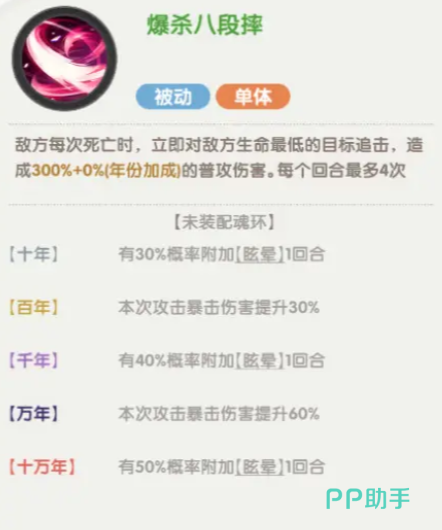被动技“爆杀八段摔”会在敌方单位阵亡时触发,自动追击敌方血量最低者,造成300%基础伤害并计入年份加成的普攻伤害,最多连续触发4次。搭配不同年份魂环时效果各异:10年提供30%概率附加1回合眩晕;百年提升此次攻击的暴击伤害30%;千年具备40%几率施加1回合控制;万年进一步提升暴击伤害至60%;十万年则拥有50%概率附加1回合眩晕效果,显著增强收割能力。