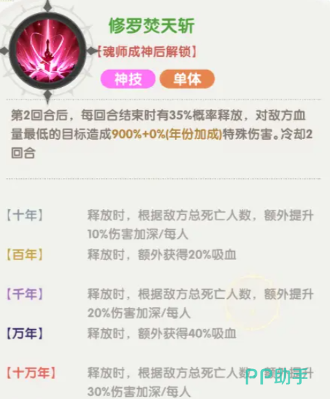 修罗神形态下的专属成神技,自第2回合起每回合结束时有35%概率释放,针对敌方血量最低单位造成900%基础伤害并叠加年份加成的特殊伤害,该技能拥有2回合冷却时间。十年魂环可根据当前已死亡敌方数量提升伤害,每人增加10%加成;百年魂环额外赋予20%吸血效果;千年魂环将伤害增幅比例提升至20%;万年魂环吸血比例增至40%;十万年魂环则使伤害加成比例达到30%,大幅提高持续作战能力。