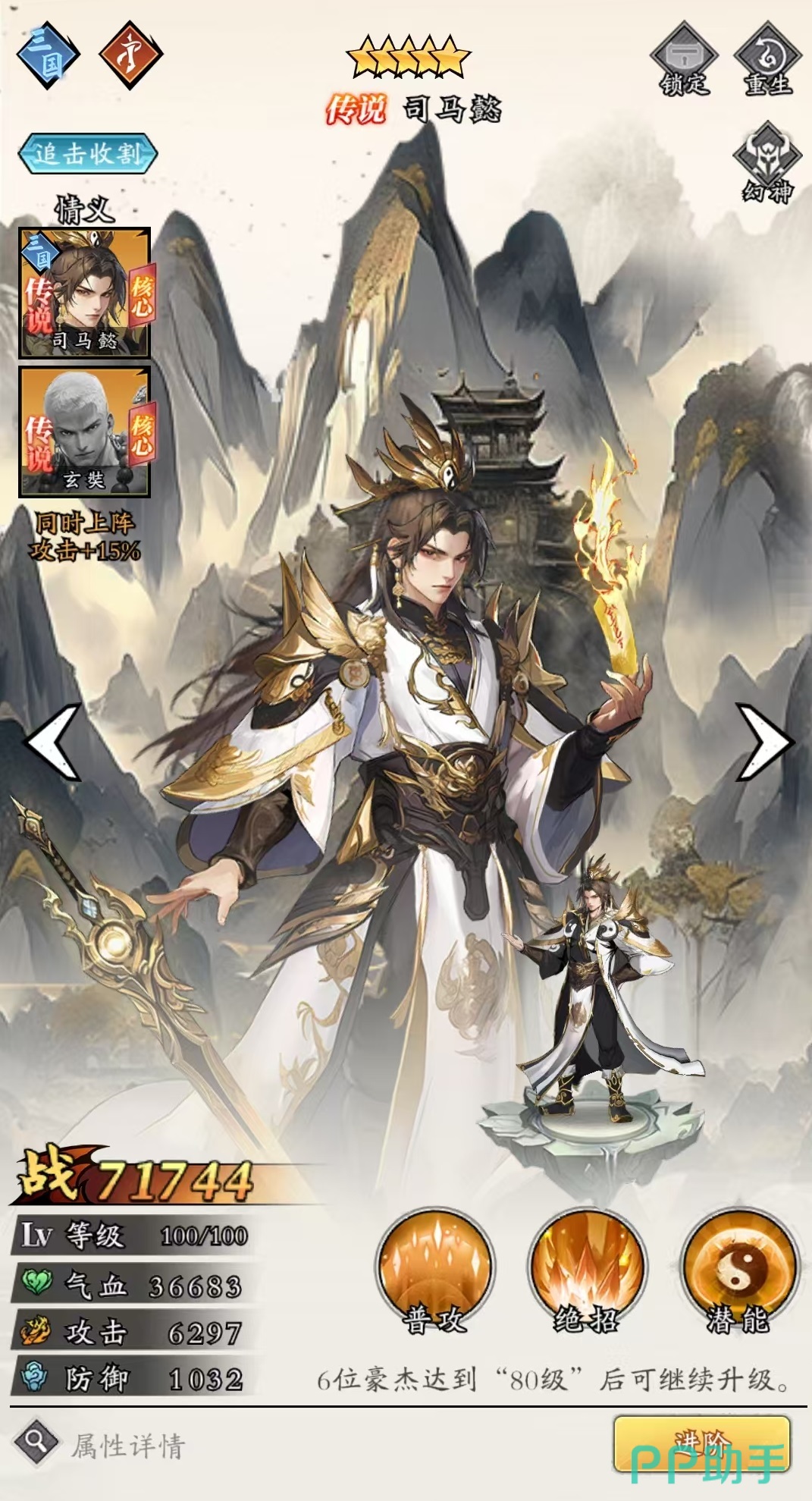 司马懿的核心优势在于高频追击与伤害叠加。他的普通攻击可打击敌方一整列单位,若成功击杀目标,则能立即追加一次普攻。其绝招同样作用于纵排敌人,造成范围伤害后,自身伤害属性提升10%,效果可持续三回合,并支持多次叠加。若技能击杀敌人,亦可触发一次额外普攻。潜能强化后,司马懿每次行动都会提升自身伤害,最高可达100%;同时,每当队友行动时,他可获得一层“狼顾”状态,累计八层即可额外释放一次技能,极大增强了输出频率和战场压制力。