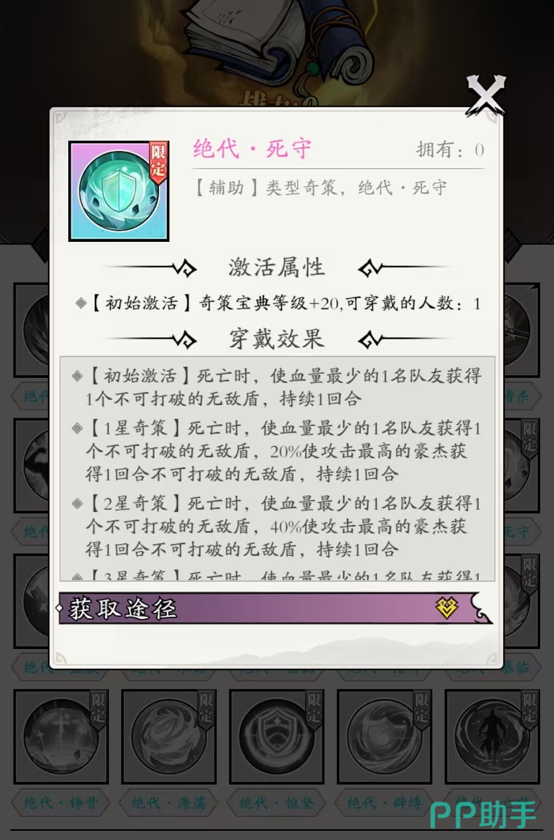 推荐司马懿使用的奇策组合包括:绝代嗜好杀、传说秦始皇、绝代死守、绝代长驱、传说貂蝉、传说司马懿、传说杨戬以及史诗鲁班。其中,“绝代嗜好杀”可在普攻时提高暴击触发概率,完美契合司马懿依赖普攻追击的输出模式。“绝代死守”在穿戴者死亡时,为血量最低的队友提供不可打破的无敌护盾,并有一定几率为攻击力最高的单位附加同类型保护,增强团队生存能力。