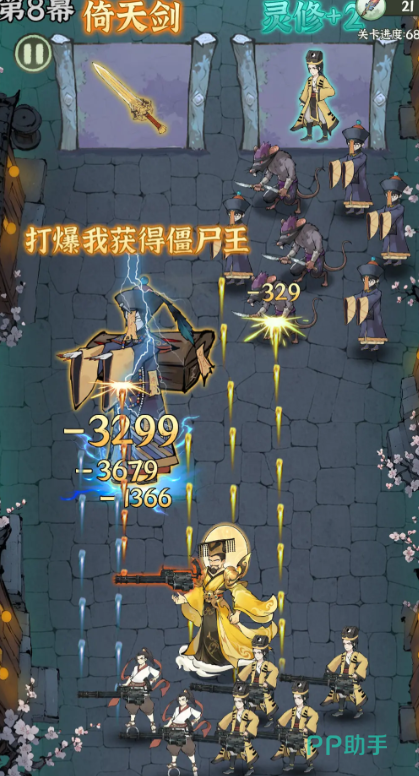跑酷玩法按章节推进,每位出战的灵修角色都将独立完成关卡挑战。玩家需在途中权衡奖励选择,例如获取倚天剑增强战力,或增加灵修数量提升续航能力,合理决策是通关高难度区域的关键。
