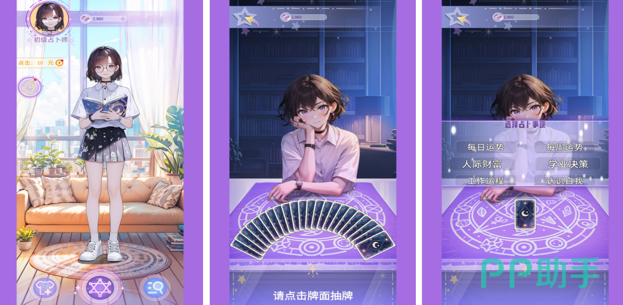 这是一款融合换装养成与塔罗互动的创意手游,玩家将化身形象精致的占卜师,通过操作二十多张经典塔罗牌进行运势解读。游戏不仅还原了真实的牌义解析流程,还加入了个性化装扮系统,让角色更具辨识度。每一次抽牌都伴随着视觉与剧情的双重反馈,增强了沉浸式体验,为喜欢角色扮演与心理探索的用户提供了新颖选择。