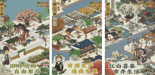 该游戏以明代江南地区为背景,采用传统水墨画风呈现古韵风情。玩家需负责城镇的整体规划,包括民居、商铺及手工作坊的布局。通过发展农业、商业、手工业等产业获取收益,推动小镇持续繁荣。画面细腻,场景还原度高,充分展现古代市井生活气息。从初期建设到后期经营,每个阶段均可自由调控,打造出独具特色的江南水乡。