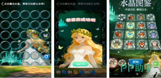 这是一款结合记忆与反应能力的益智游戏。开局时,各种可爱的小动物图案会清晰展示在水晶球阵列中,玩家需在规定时间内记住它们的位置。随后画面翻转,所有图案隐藏,玩家须依据记忆依次点击正确位置,还原并消除所有图像,最终解救被困的小公主。