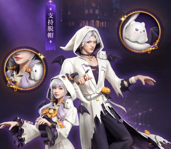 另一款“床单小鬼”套装则走轻松诙谐路线,还原经典万圣节扮相。通体白色的蓬松床单搭配摇曳的南瓜灯和蝴蝶结小帽,让幸存者瞬间化身为调皮捣蛋的小幽灵。该套装支持切换戴帽状态,便于展示角色原有的发型与面部妆容细节。