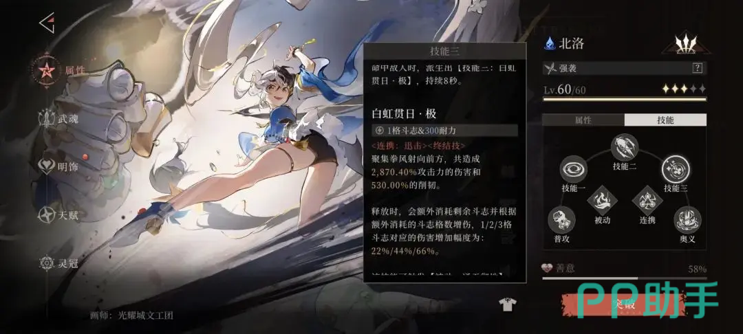 当北洛与柯尔特共同在场时,可触发魂火共鸣迅影连击机制。具体条件为:任意角色在0.5秒内对敌人造成不少于5次攻击即可激活。触发后,全队获得基于北洛攻击力的伤害加深效果。每100点攻击力提供0.4%的增益,最高叠加至2500点攻击力,即最多提升10%伤害,持续时间为30秒。若队伍中存在其他具备连携迅击的角色,则每100点攻击力带来的加成额外增加0.2%,进一步放大整体输出收益。