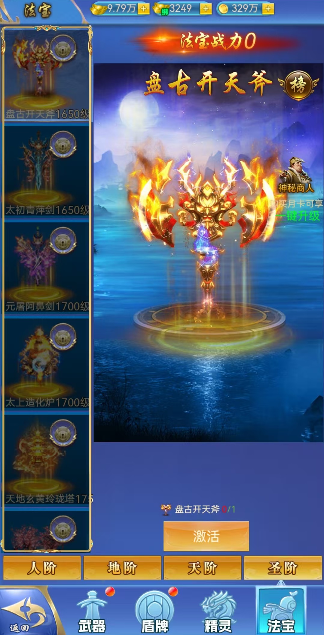 游戏中共设有四大类神器:武器、盾牌、精灵与法宝,每一类均划分为四个等级品质,由低至高依次为人阶、地阶、天阶和圣阶。不同品阶的神器拥有差异化的属性加成与技能效果。已激活的神器不仅提供基础属性,其附带技能也会实时生效,且多个神器技能可叠加触发。因此,激活更多神器意味着更强大的综合战斗力,尤其在挑战高难度BOSS时,神器技能往往成为胜负的关键因素。