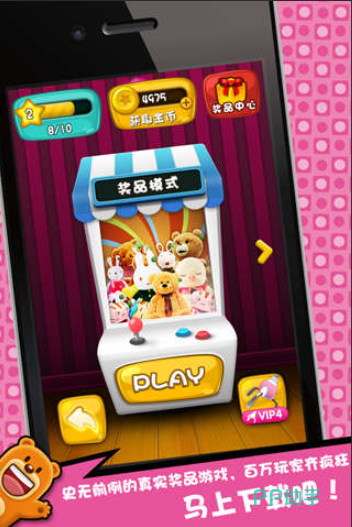 主打“无限投币”模式,玩家无需担心游戏币不足的问题,可长时间连续畅玩。角色形象风格多样,每一款娃娃都有独特外观和主题设定,观赏性极强。搭配轻快活泼的背景音乐,营造出轻松愉悦的游戏氛围。创新引入重心调节机制,让抓取过程更具策略性和真实感,提升整体可玩度。