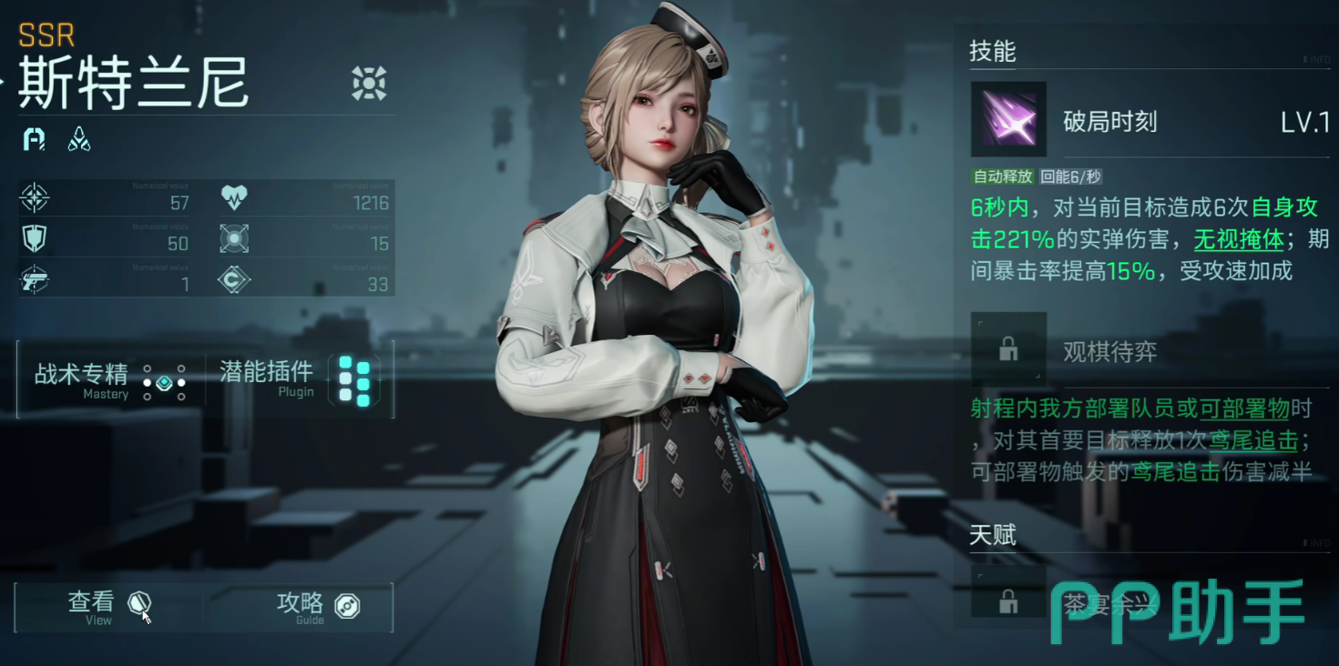 斯特兰尼在游戏当中,可以对当前目标造成一次基于自身攻击倍率为221%的真实伤害,同时无视掩体,期间暴击率还会提升15%,是一个攻速流的输出型角色。