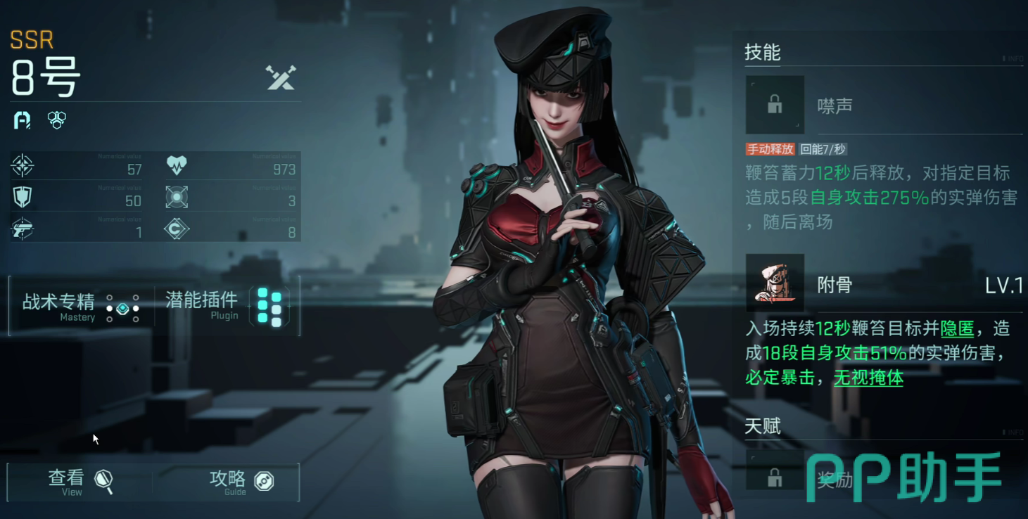 8号是游戏内的高属性值刺客单位,犀利攻击技能释放后,会对指定的目标造成基于自身基础攻击倍率为275%的伤害,且该伤害由四段,同时也是游戏内唯一一个可以隐身的角色。