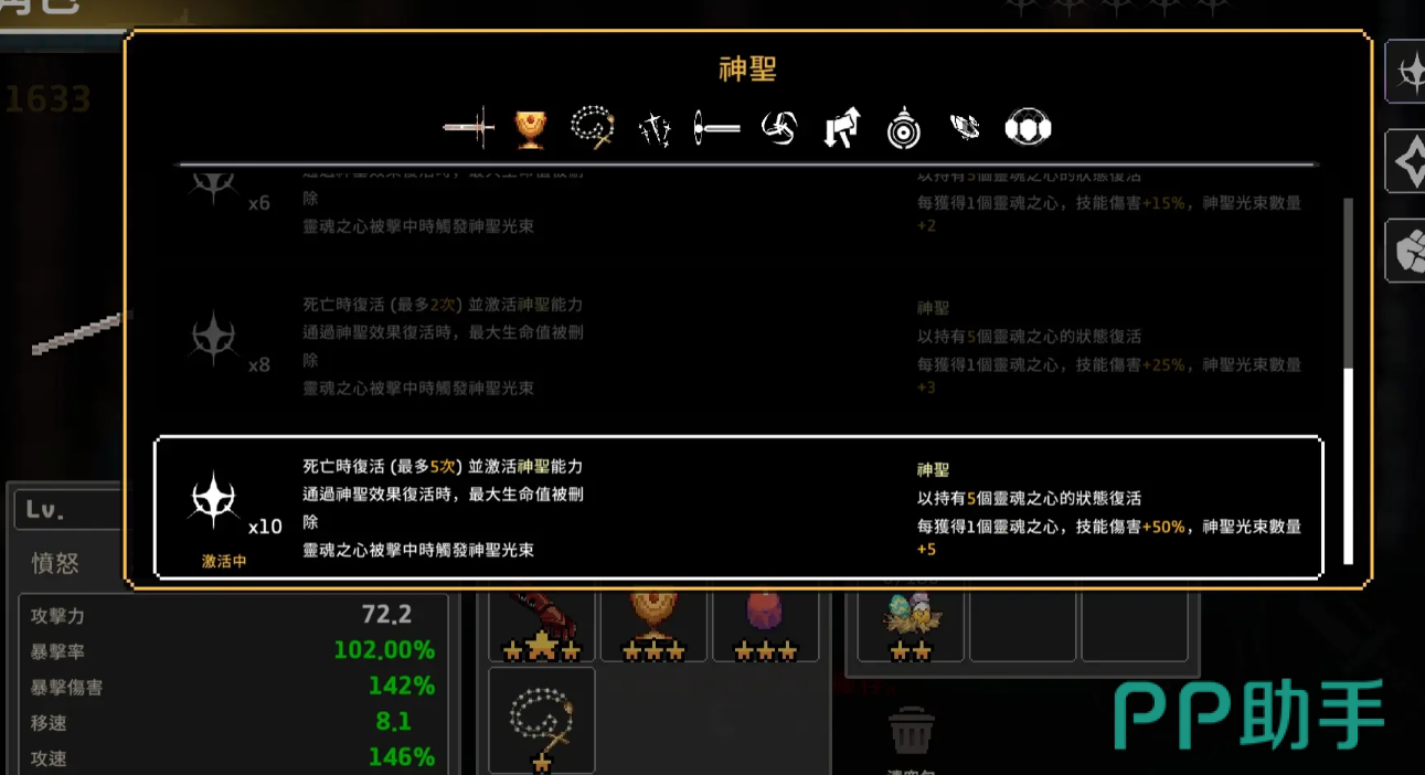 此外,在复活机制方面,建议重点强化神圣属性的复活技能。该技能可在龙人战败后立即复活,并推荐将神圣点数点满,使最多复活次数达到五次。同时,每次复活后还能提升技能伤害50%,并额外生成5道神圣光束。结合龙人在人形与龙形之间的灵活切换,此配置能发挥出极强的战场续航与压制力。