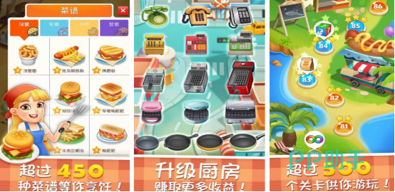 有超过500多种菜谱,等待你解锁经营多家你喜欢的店面,根据每位顾客的点餐需求来制作出特色美食,还要研究新品。其中的餐具多种多样,最初厨房当中餐具是比较单一的,不过随着时间推移可以自由解锁。可自由补充原材料,随着顾客逐渐增多,玩家还要全面升级餐厅当中的各类型设备,比如收款机以及高级订货电话等。
