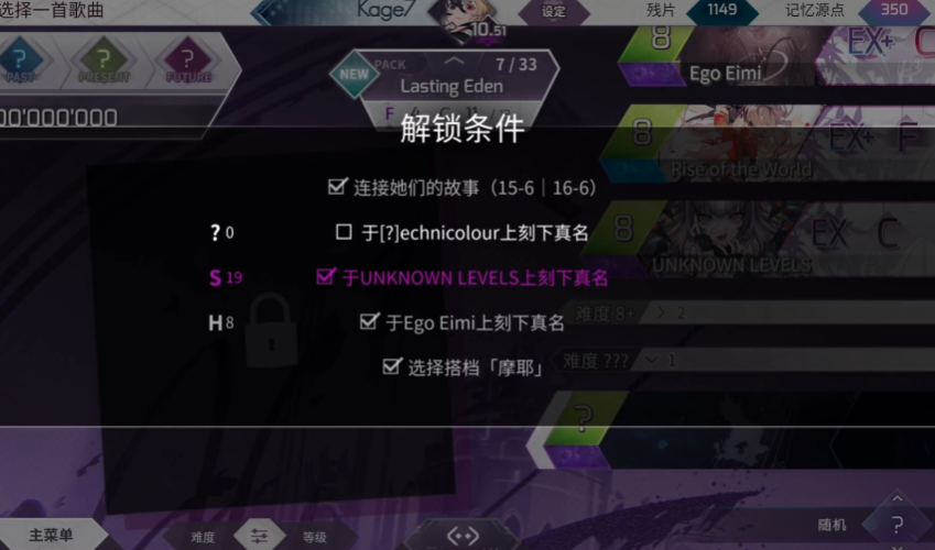 完成上述章节后,将激活三个关键解锁任务。第一个任务要求演奏曲目《technicolour》,无需完整通关,只需在演奏过程中达到指定连击数后退出即可。建议选择前半段节奏较为平稳的部分集中操作,避免因误触或提前中断导致失败。第二个任务需挑战《unknown levels》,并在开始前将音符流速调整至一个中等数值。此设置对节奏感知有一定影响,初次使用时需短暂适应视觉与操作之间的协调性。第三个任务需要更换为摩耶作为当前搭档,演奏《ego eimi》时会触发特殊事件——屏幕中会出现洞烛的形象,此时需及时点击该形象以完成任务。建议先进行一次试玩,熟悉异象出现的大致时机,以便在正式挑战时兼顾连击维持与事件触发。