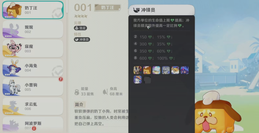 目前游戏中的奶丁汪是非常适合做饱足流的一个宠物,因为它也是饱足元理当中的一个精灵,它的能力主要是冲锋员的特性比较强,这个精灵的话,它使用技能能量消耗为33焦,所以前期使用还是有足够的能量可以供他来使用技能的,它在特点上面就是受到压力时外观会直接变形压缩,而且这个特点不光是在平时可以有一定的显露,大家在实际玩法当中也可以用到这一点,也就是在探索的阶段,其实大家就可以用到这一点,玩家可以利用动作直接站到奶丁汪的身上,然后利用它的这种弹性设定来达到一个跃起的动作。