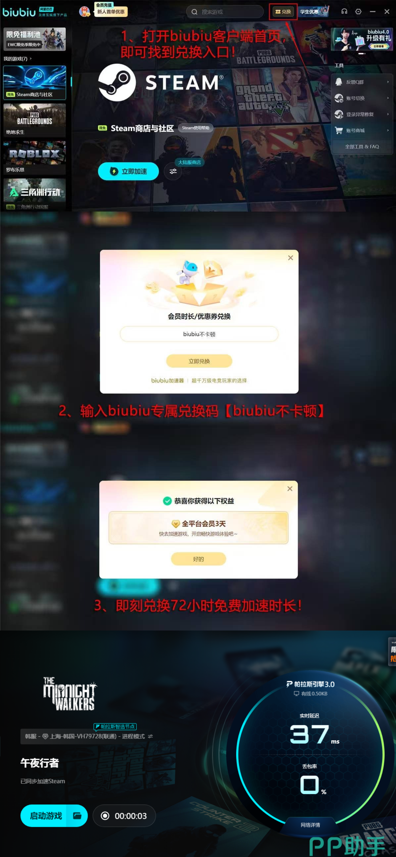 考虑到有的用户之前没有用过这个软件,平台给大家提供了不少福利,比如新用户在登录的时候会得到平台直接发放的24小时的体验机会,注册即可领取。同时还给全体用户提供了三天的体验时长,这个需要玩家自己手动通过【biubiu不卡顿】在平台的指定兑换区域输入领取。