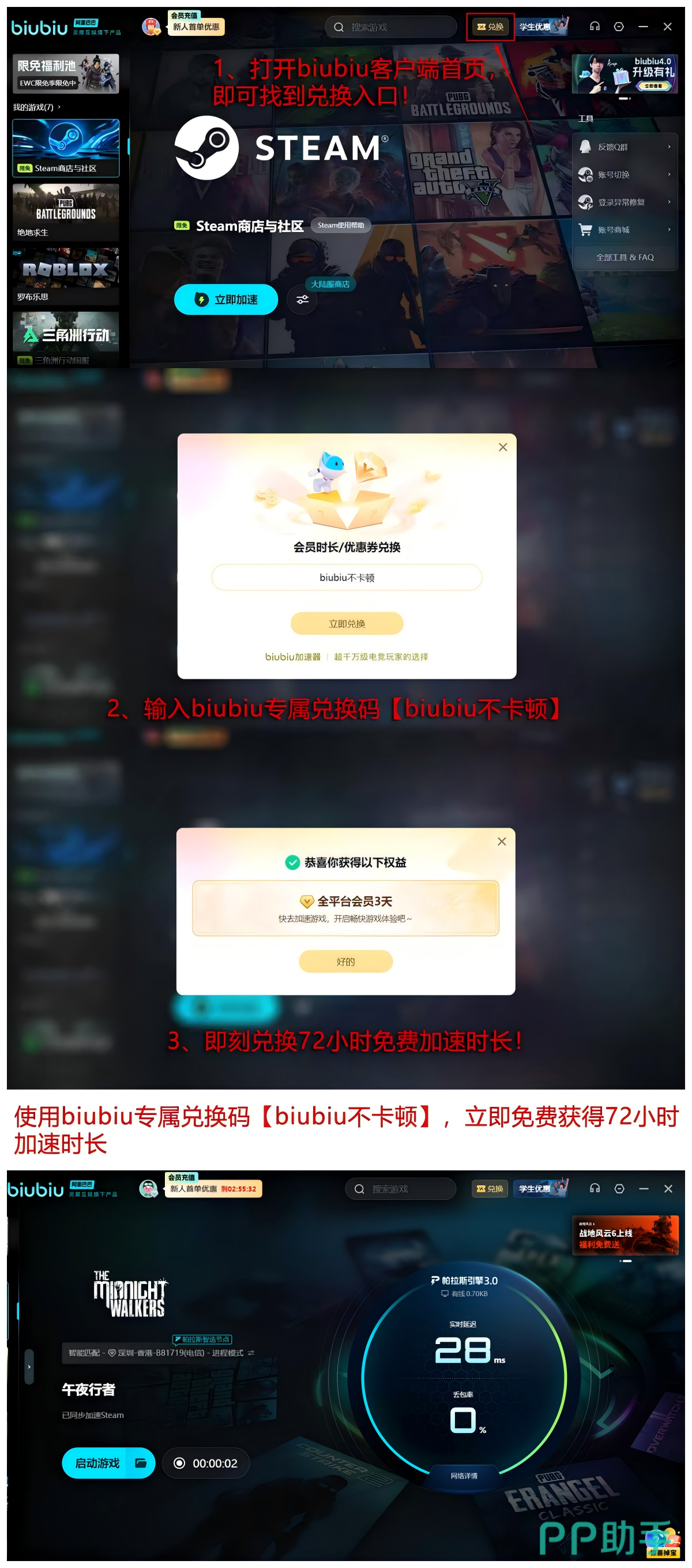 biubiu加速器是当前广受认可的网络优化工具,尚未尝试的玩家现在可通过口令【biubiu不卡顿】在右上角【兑换】处领取3天免费使用权益,若为新用户注册,还可额外获赠24小时加速时长,累计可达96小时,性价比极高。付费用户更有专属折扣福利可领取,提升整体游戏体验。