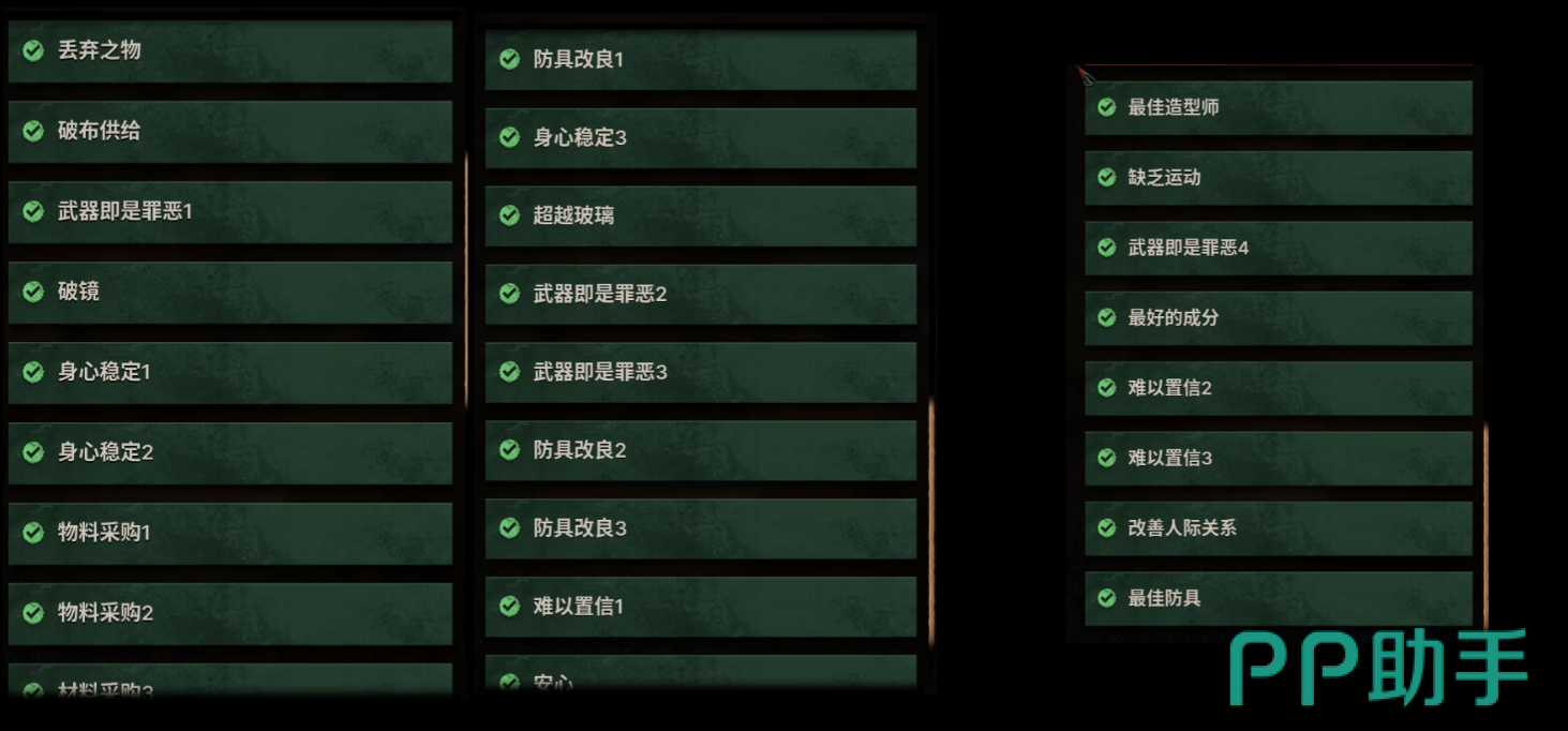 “丢弃之物”任务要求玩家前往14楼防具商人所在的房间,在该区域可找到所需物品;“破布供给”需收集并提交四个破布道具,这些物品通常出现在2号楼层的衣服店内,分布在任意角落;“武器即使罪恶”需要获取高级大锤、高级匕首以及高级废铁长矛,以上武器可在各层的武器箱中随机发现;“破镜”任务则需在旅途中拾取一个后视镜,刷新位置集中在B1层车辆周围,为高概率出没点;“贴身稳定”要求提交两份香草茶,资源刷新于1层食品货架区域;“身心稳定”则需在试炼模式中击败普通丧尸即可完成。