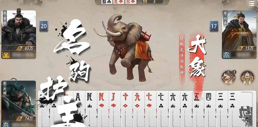 首先来看蜀国阵营,该阵营整体偏向高速进攻,擅长通过快速出牌建立优势。例如关羽,其“武圣”能力可在敌方打出顺子时,随机抽取对方一张手牌,实现资源压制;而“单骑”形态则允许他在成功出顺子后获得一张万能牌,若配合赤兔马使用,更有机会触发四联顺的特殊效果,大幅提升爆发力;