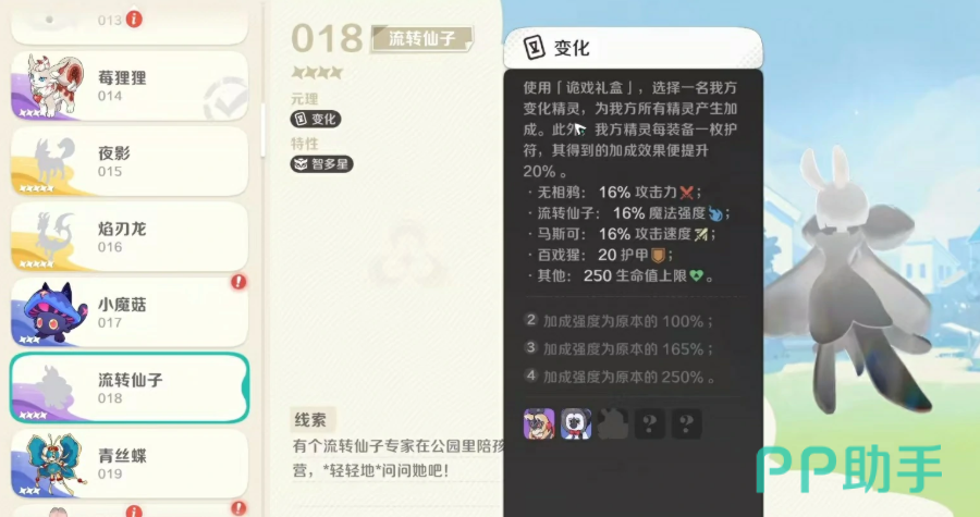 作为变化元理体系的一员,流转仙子还拥有专属原理“轨迹礼盒”,可在战斗中为另一位同属变化类型的己方精灵提供属性增益。若该精灵装备有护符,则增益效果还将额外提升20%。值得注意的是,护符所提供的加成效果与其所选形象密切相关,不同形象对应不同的属性加成方向,因此在配置时需结合整体阵容策略进行选择。