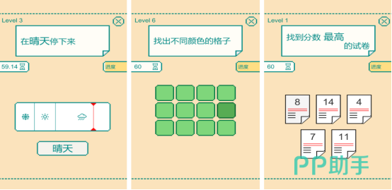 每局限时一分钟,全面检测反应速度与短期记忆。游戏随机生成各类任务,例如在多份试卷中迅速找出分数最高的那一张,或在颜色相近的方块阵列中识别出唯一不同的色块。虽然规则简单,但实际操作中需要高度集中注意力,非常适合碎片化时间进行脑力激活。