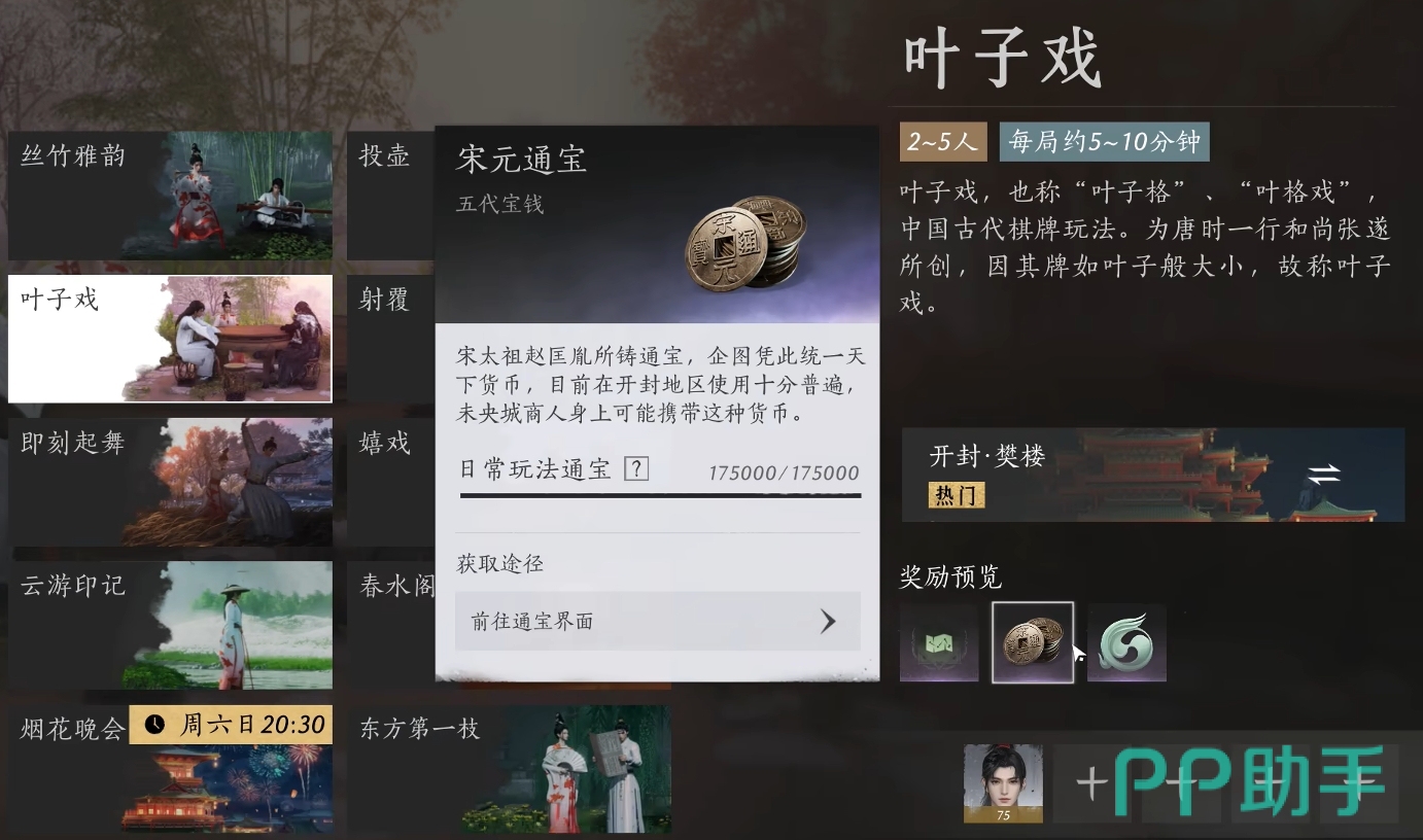 日常活动也是补充宋元通宝的有效途径,尽管存在每周获取上限,但仍值得充分利用。当前可通过“叶子戏”和“雀神争霸”两项休闲玩法累积时长来领取奖励,参与时间越长,所得宋元通宝越多。建议玩家在空闲时段积极体验这些小游戏,确保每周额度全部领取。若当周尚未用完周元通宝的兑换额度,还可优先参与能获取周元通宝的日常项目,随后在兑换界面将其转化为宋元通宝,进一步提升资源利用率。