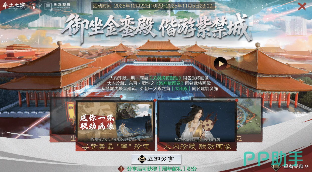 本次联动将于2025年10月22日正式开启,玩家可通过【率土庆典】入口进入专属的【故宫观唐联动】页面。此次活动将古代艺术与三国策略巧妙融合,让玩家在征战沙场的同时,沉浸式感受盛唐气象与宫廷美学交织的独特氛围。通过分享活动主界面还可获取【周年献礼】积分,用于兑换限定奖励。