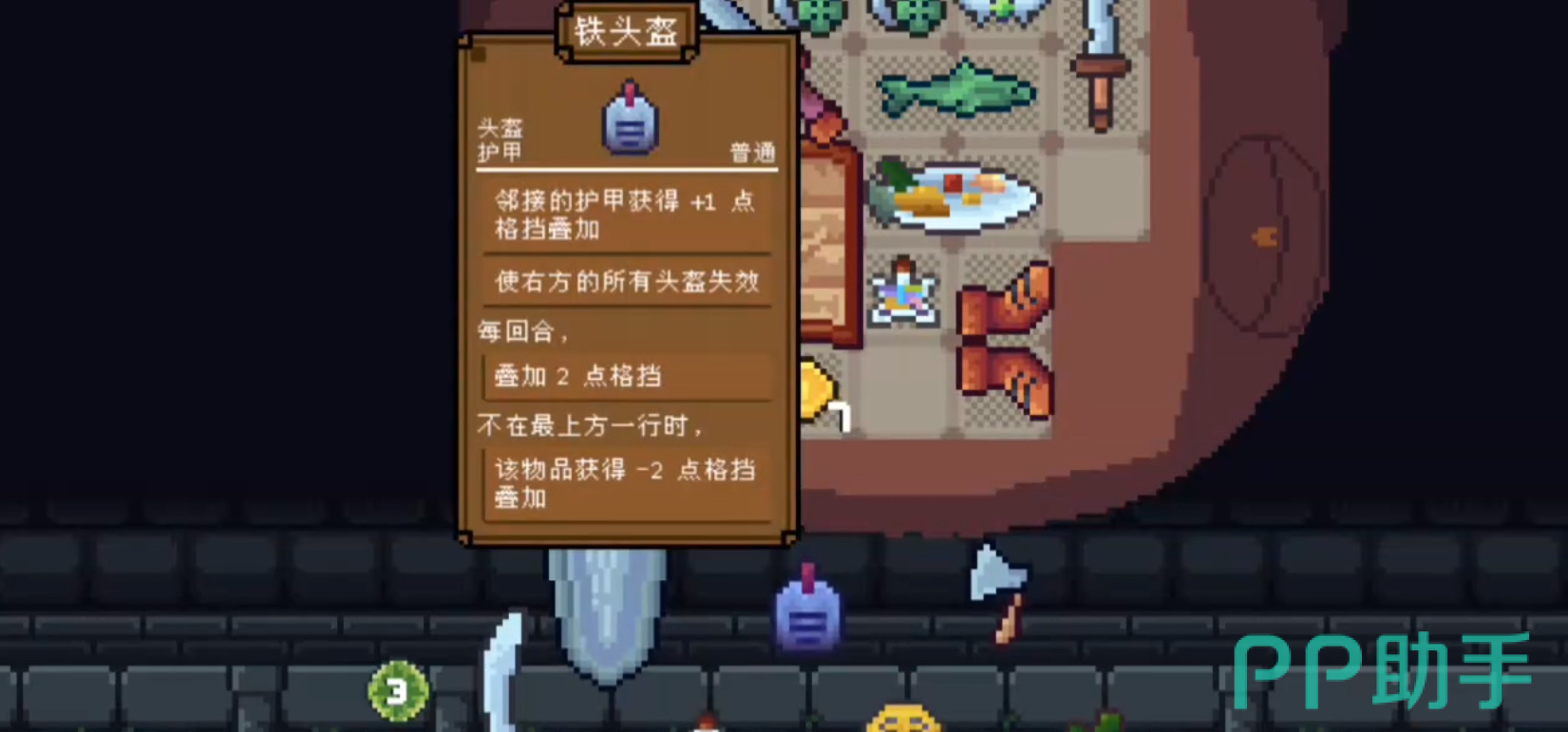 在游戏前期,优先选择具备防御能力的装备能有效提高生存率。铁头盔是初期较为实用的选择之一,其使用方式为将其置于护甲相邻的位置,即可获得1点格挡值加成。此外,该装备还能使位于其右侧的所有头盔类物品失效,每回合稳定提供2点格挡效果。若条件允许,可升级为带刺头盔,除具备相同的失效机制外,还可叠加4点刺甲属性,进一步增强反伤能力。