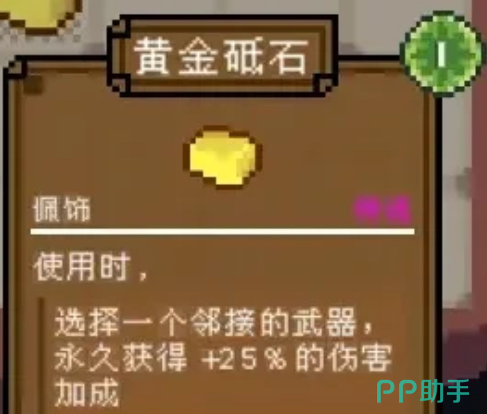 黄金砥石属于装备配件,无法单独使用,必须放置在武器相邻格子中才能激活其效果。当成功搭配后,可为对应武器提供25%的额外伤害加成。这项属性显著增强了角色输出能力,在面对高难度关卡时尤为关键,因此该道具在玩家中拥有极高评价。