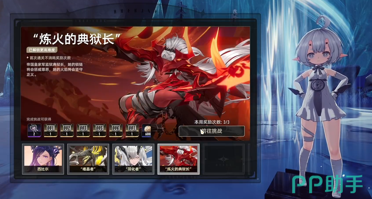 炼火的典狱长是帝国皇家军监狱典狱长,她的锁链将会惩戒罪恶,她的火焰将会坚守正义。要是顺利完成挑战的话,除了可以获得各种随机奖励外,还能获得周本材料,甚至首次挑战还不会消耗获奖次数,一周可以获得三次挑战奖励的机会!确认无误后,即可开始前往了。