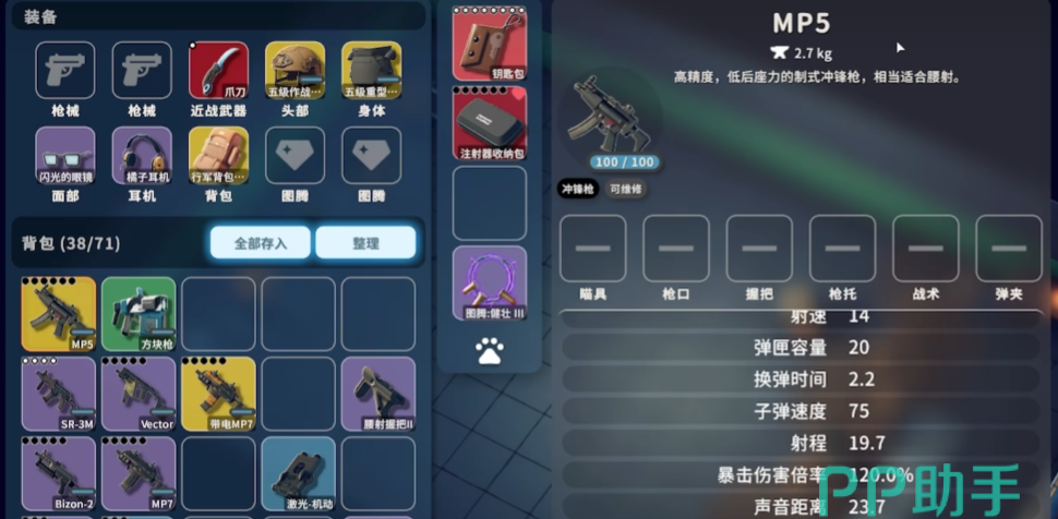 逃离鸭科夫mp5总体来说算是非常好控制,也很强力的腰射武器,在按照小编的推荐搭好配件之后,后坐力会进一步减小,而且弹道也更为集中,子弹容量再一扩大,可以持续射击很久。如果是刚玩的萌新,用这款武器战斗,会更容易上手。