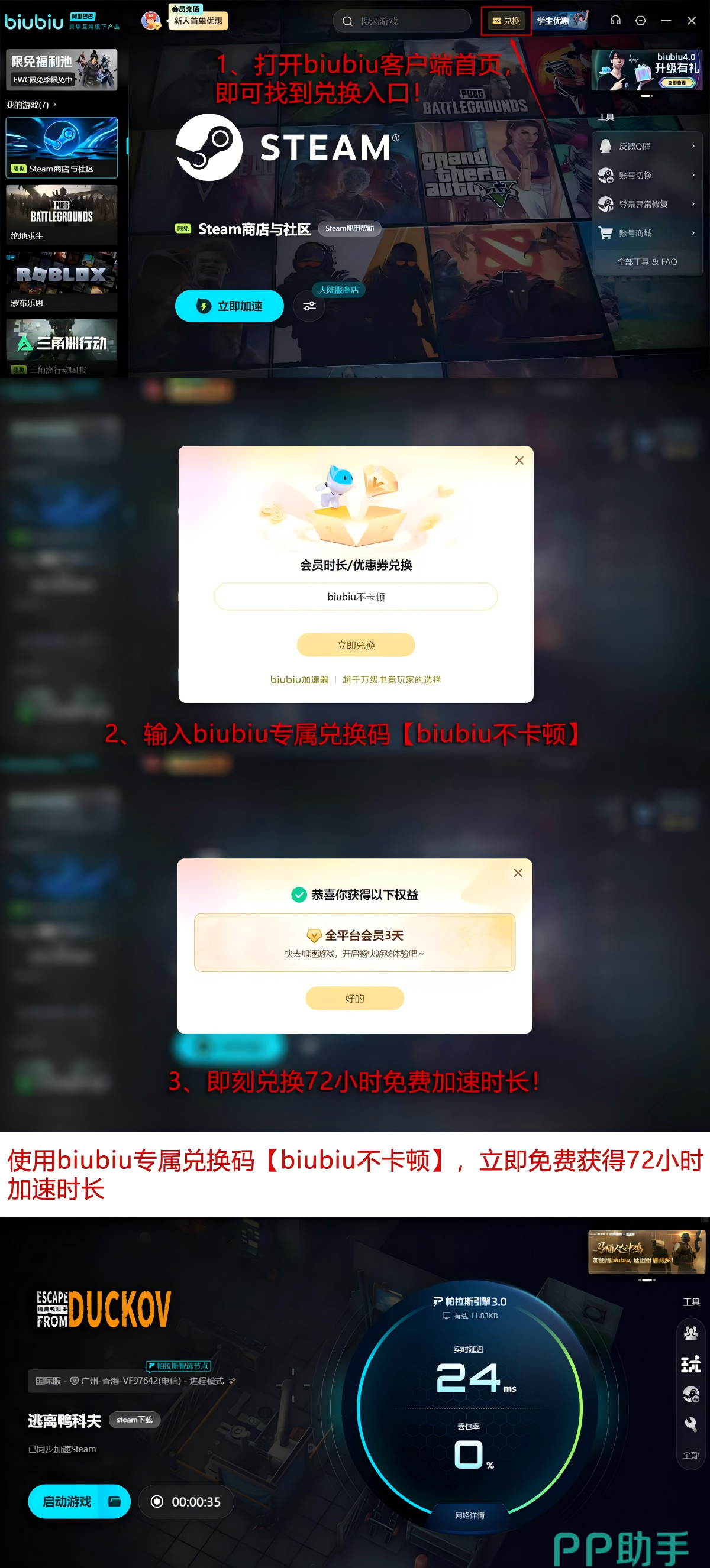 使用biubiu时,是可以领很多免费优惠的,注意新人分到的最多,登录后有专属礼包,新用户畅用24小时加速服务,【biubiu不卡顿】是另外口令,用了就能领取到72小时额外服务时间,新人实际一口气能用上96小时。