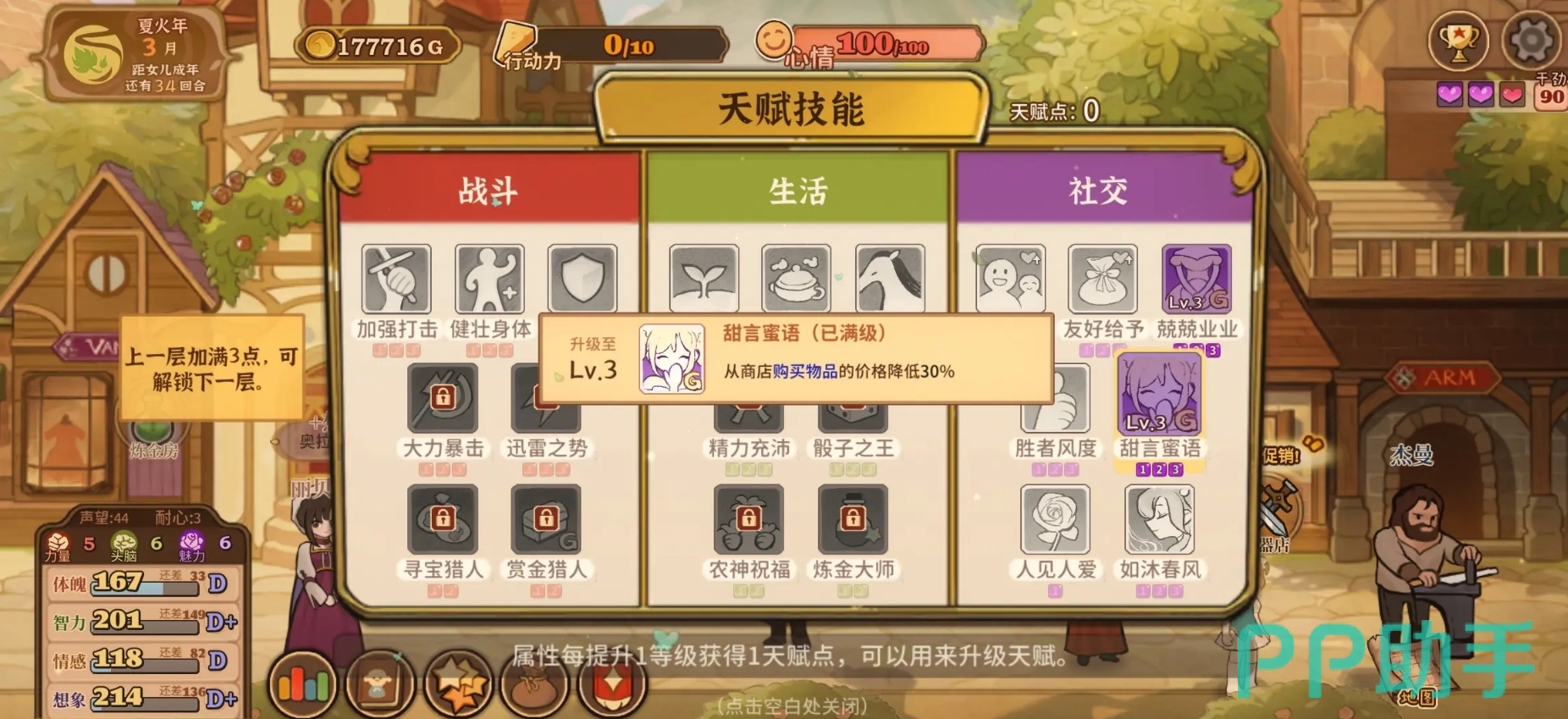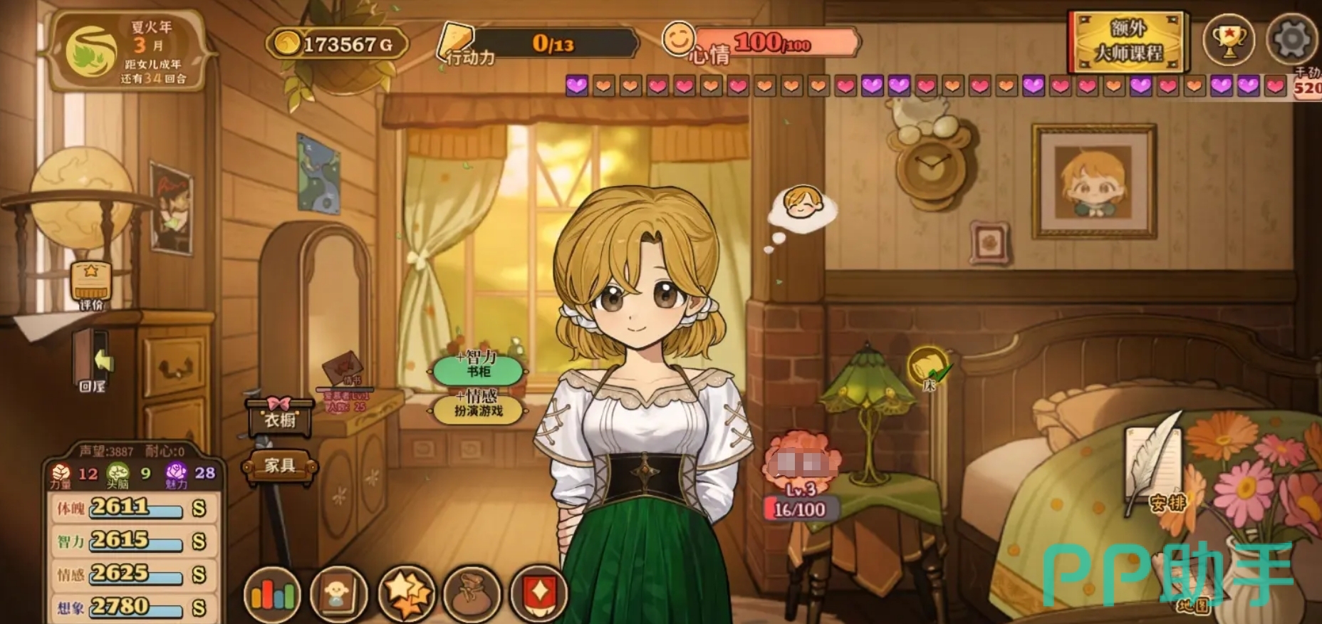 每次为女儿规划活动都需要消耗行动力,不同项目所需数值各异。当行动力归零时无法继续安排事务,但可通过特定天赋或休息操作恢复或提升上限。角色属性的增长不仅依赖课程安排,还能通过丰富的互动玩法实现,成长途径多样且上限极高,全属性满值培养具备可行性。结合细腻的交互设计,整个过程极具代入感,让玩家真切感受到参与孩子成长的满足与情感联结。