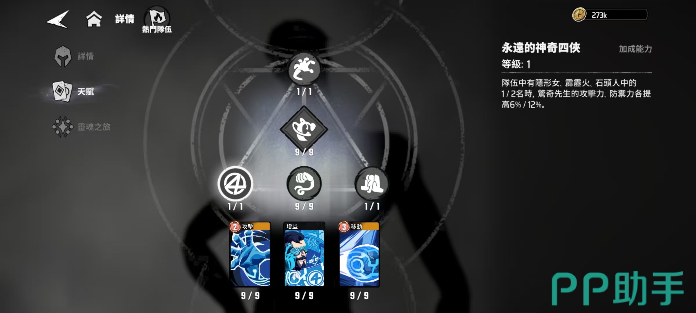 此外,若追求羁绊加成最大化,可尝试组建“神奇四侠”主题阵容。当队伍中包含霹雳火与石头人时,配合神奇先生即可激活专属天赋“永远的神奇四侠”。此状态下,神奇先生的攻击力提升6%,防御力提升12%,达到最高层级的属性加成。同时,霹雳火与石头人的技能机制也与神奇先生高度契合,既能提供前排承伤支持,又能参与联动控制与输出,整体协同效率极高。