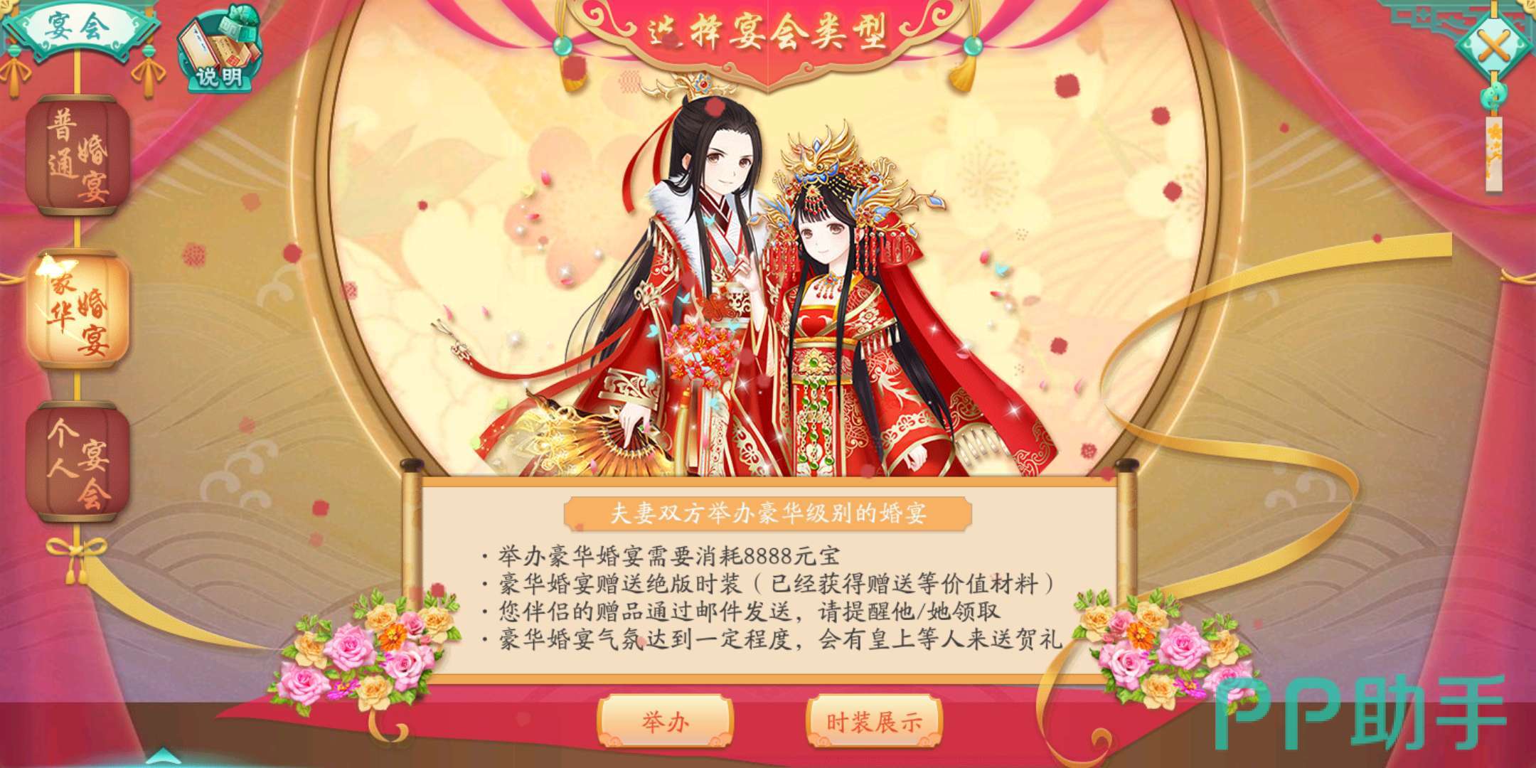 豪华婚宴则需要花费888元宝(折合人民币88.8元),举办成功后双方会获得绝版时装,在邮箱查收。在豪华婚宴人气足够高的时候,皇上会亲自到婚宴现场送礼,在游戏里可以说是非常有排面了。