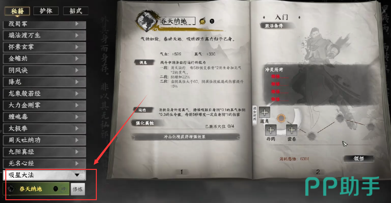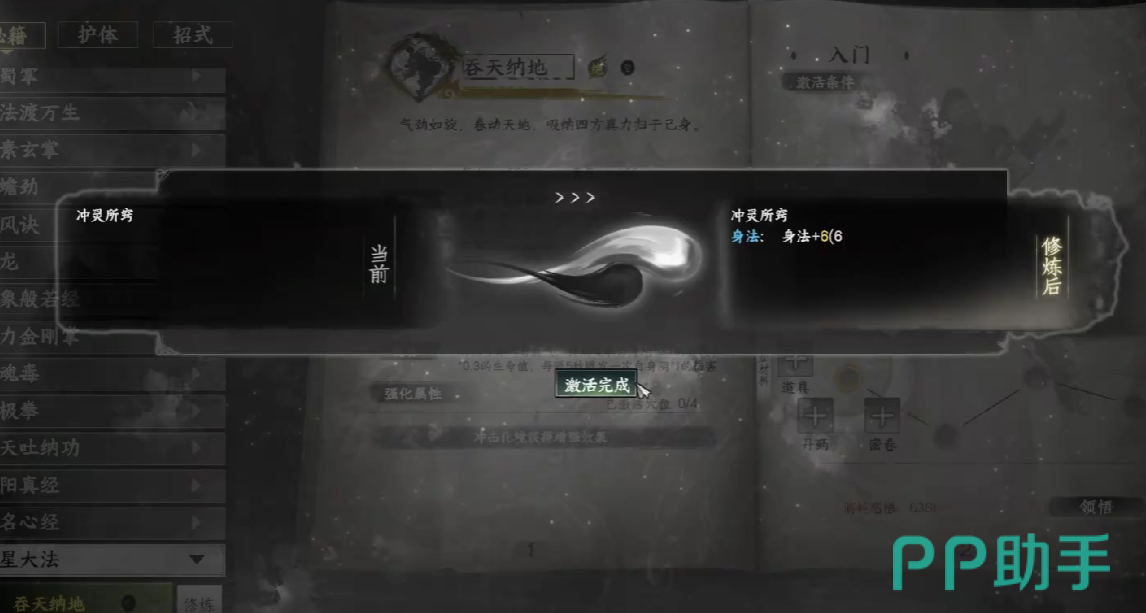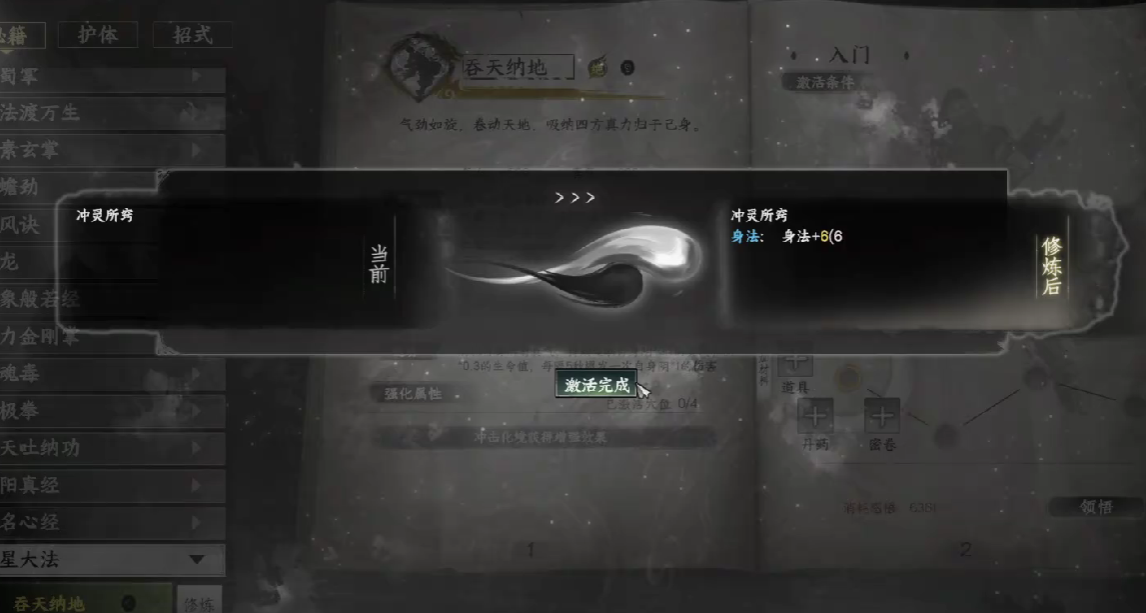 在搭配武学流派时,建议配合拳法或长剑类招式使用,避免选择依赖真气持续输出的技能体系,因吞天纳地本身需要消耗全部真气来驱动吸纳机制。同时,为最大化其战斗效能,玩家应优先提升角色的阴属性,从而提升恢复效率与伤害倍率。